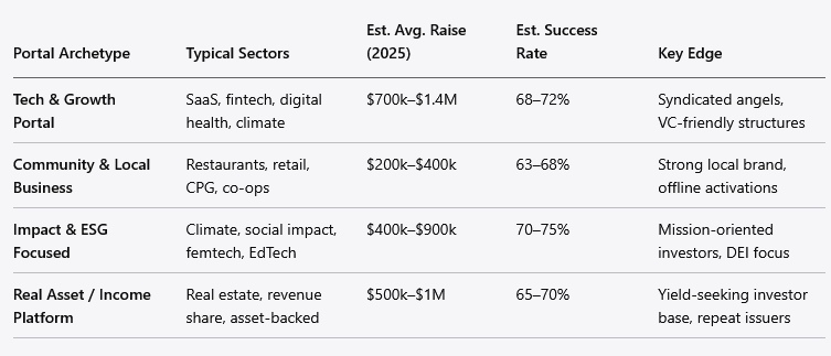 2025 marked ongoing consolidation among FINRA‑registered portals. While names differ in reality, we can characterize four archetypes and their performance patterns.