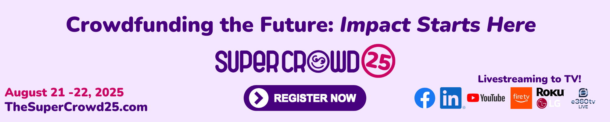SuperCrowd25, August 21st and 22nd: This two-day virtual event is an annual tradition, but with big upgrades for 2025! We’ll be streaming live across the web and on TV via e360tv. VIP’s get access to our better-than-in-person networking! Get your VIP access for just $25.