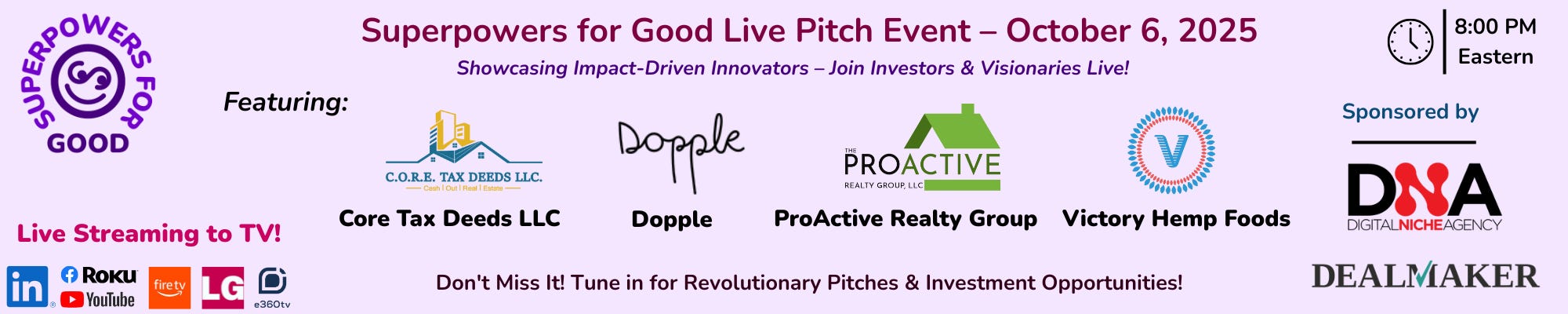 Superpowers for Good Live Pitch on October 6, 2025, hosted by Devin Thorpe on e360tv, will feature Core Tax Deeds, Dopple, ProActive Realty Group, and Victory Hemp Foods pitching their active Regulation Crowdfunding campaigns to a nationwide audience. Viewers can vote for their favorite companies, win prizes, ask live questions, and join a private investor Zoom session to engage directly with founders and even invest during the show. Don’t miss this free chance to discover and support purpose-driven startups—register here: https://thesupercrowd.com/25q3pitch