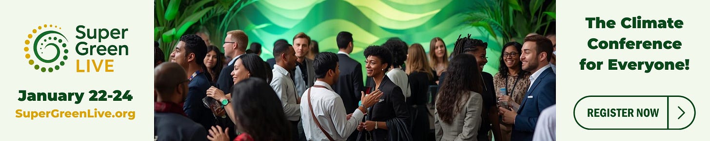 SuperGreen Live, January 22–24, 2026, livestreaming globally. Organized by Green2Gold and The Super Crowd, Inc., this three-day event will spotlight the intersection of impact crowdfunding, sustainable innovation, and climate solutions. Featuring expert-led panels, interactive workshops, and live pitch sessions, SuperGreen Live brings together entrepreneurs, investors, policymakers, and activists to explore how capital and climate action can work hand in hand. With global livestreaming, VIP networking opportunities, and exclusive content, this event will empower participants to turn bold ideas into real impact. Don’t miss your chance to join tens of thousands of changemakers at the largest virtual sustainability event of the year. Learn more about sponsoring the event here. Interested in speaking? Apply here. Support our work with a tax-deductible donation here.