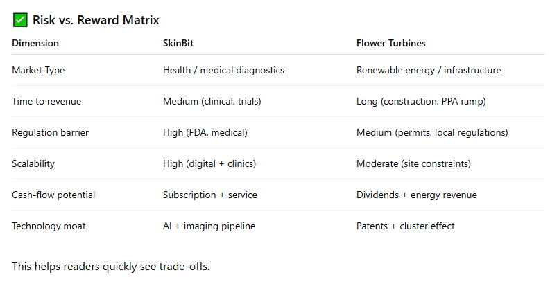Both companies lean heavily on patents: SkinBit with imaging + AI, Flower with cluster-effect turbine designs. IP serves as a barrier and a signal to investors.