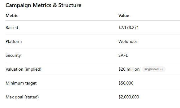 Notably, the campaign oversubscribed well beyond its minimum. The SAFE structure indicates that early investors get rights to convert into equity under certain conditions (future priced round), rather than direct equity now — a common tactic in early-stage, high-risk tech ventures.