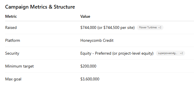 Flower Turbines is not just selling “equity in a company” but direct infrastructure projects. That hybrid approach appeals to investors wanting both impact and physical asset-backed returns.