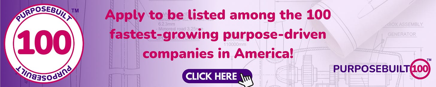 PurposeBuilt100™ celebrates the teams behind the fastest-growing purpose-driven companies in America. If you’re a founder, consider applying. If you’re not, you almost certainly know one who should.