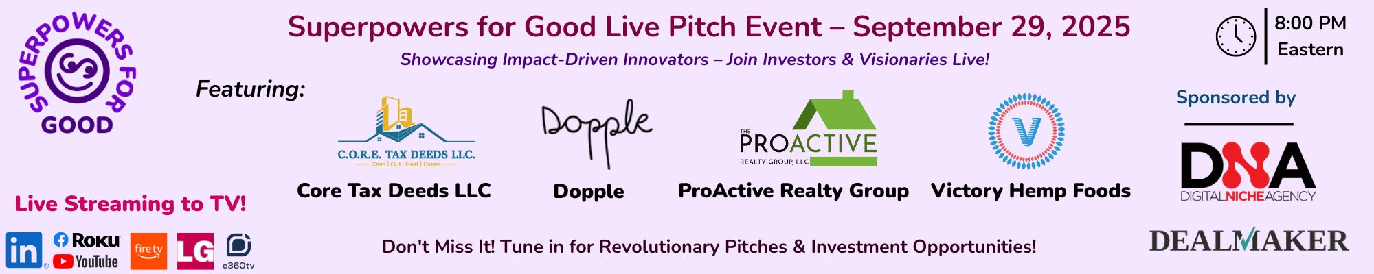 Superpowers for Good Live Pitch on September 29, 2025, hosted by Devin Thorpe on e360tv, will feature Core Tax Deeds, Dopple, ProActive Realty Group, and Victory Hemp Foods pitching their active Regulation Crowdfunding campaigns to a nationwide audience. Viewers can vote for their favorite companies, win prizes, ask live questions, and join a private investor Zoom session to engage directly with founders and even invest during the show. Don’t miss this free chance to discover and support purpose-driven startups—register here: https://thesupercrowd.com/25q3pitch