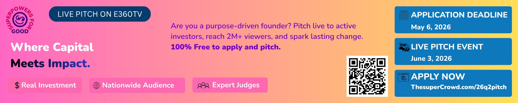 Superpowers for Good Live Pitch on e360tv — June 3, 2026. Purpose-driven founders raising capital through Regulation Crowdfunding are invited to apply by May 6, 2026, for a chance to pitch live to a national audience of investors and impact champions.