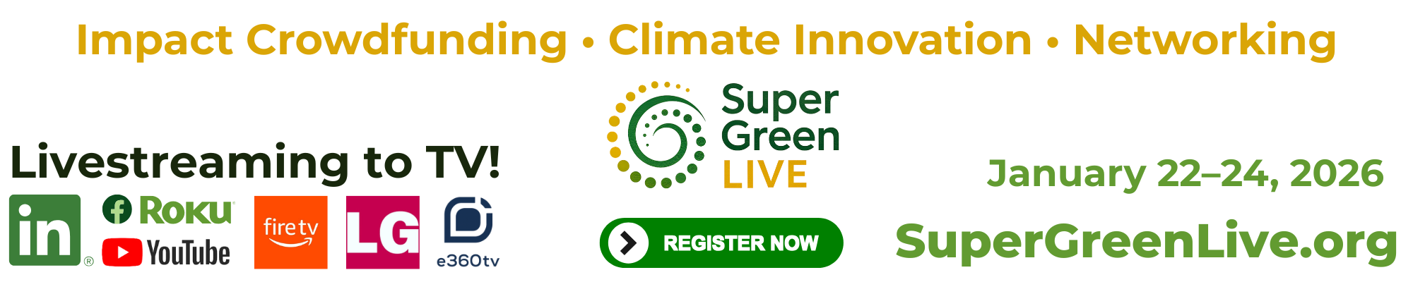 SuperGreen Live, January 22–24, 2026, livestreaming globally. Organized by Green2Gold and The Super Crowd, Inc., this three-day event will spotlight the intersection of impact crowdfunding, sustainable innovation, and climate solutions. Featuring expert-led panels, interactive workshops, and live pitch sessions, SuperGreen Live brings together entrepreneurs, investors, policymakers, and activists to explore how capital and climate action can work hand in hand. With global livestreaming, VIP networking opportunities, and exclusive content, this event will empower participants to turn bold ideas into real impact. Don’t miss your chance to join tens of thousands of changemakers at the largest virtual sustainability event of the year. Learn more about sponsoring the event here. Interested in speaking? Apply here. Support our work with a tax-deductible donation here.